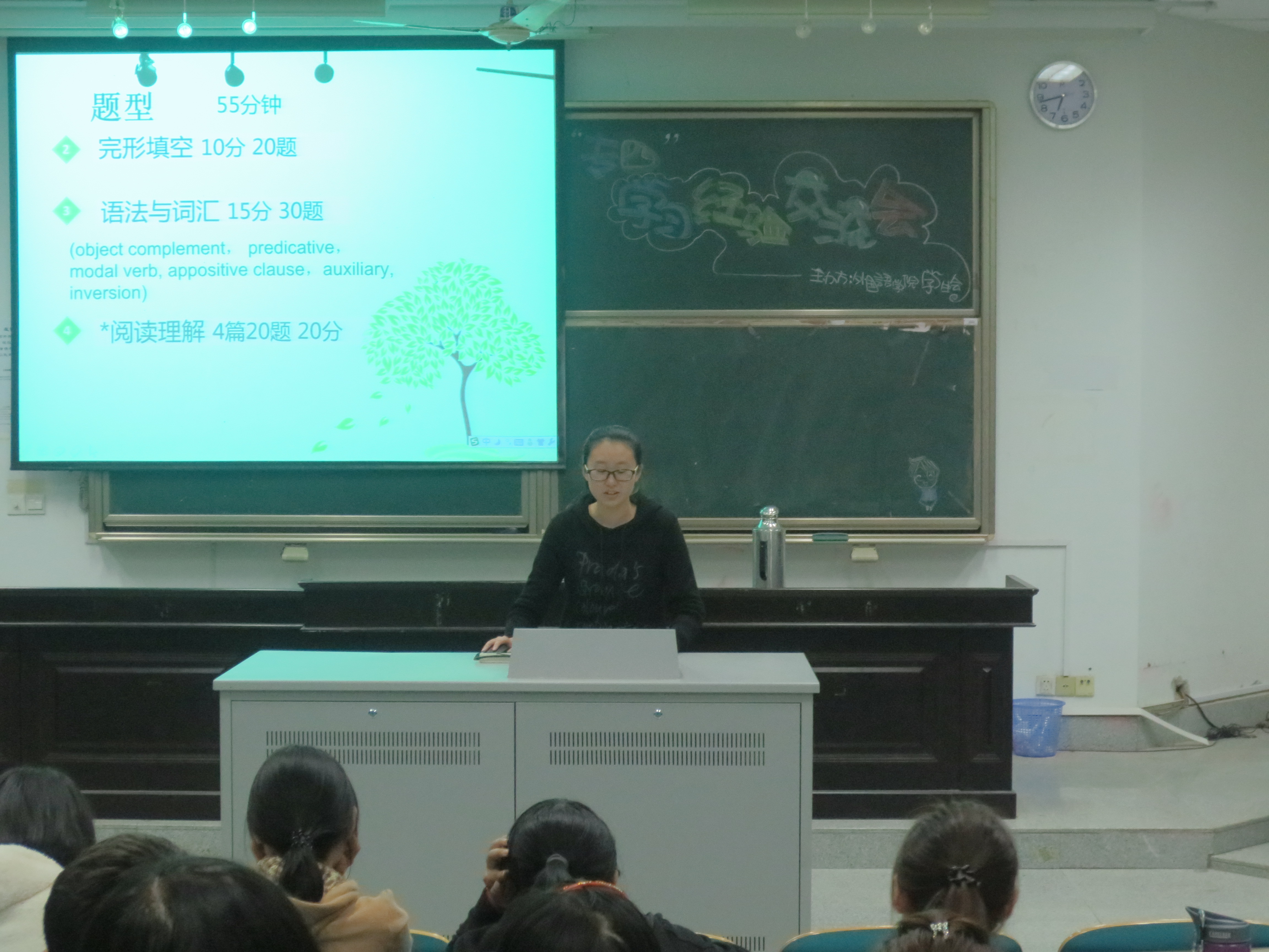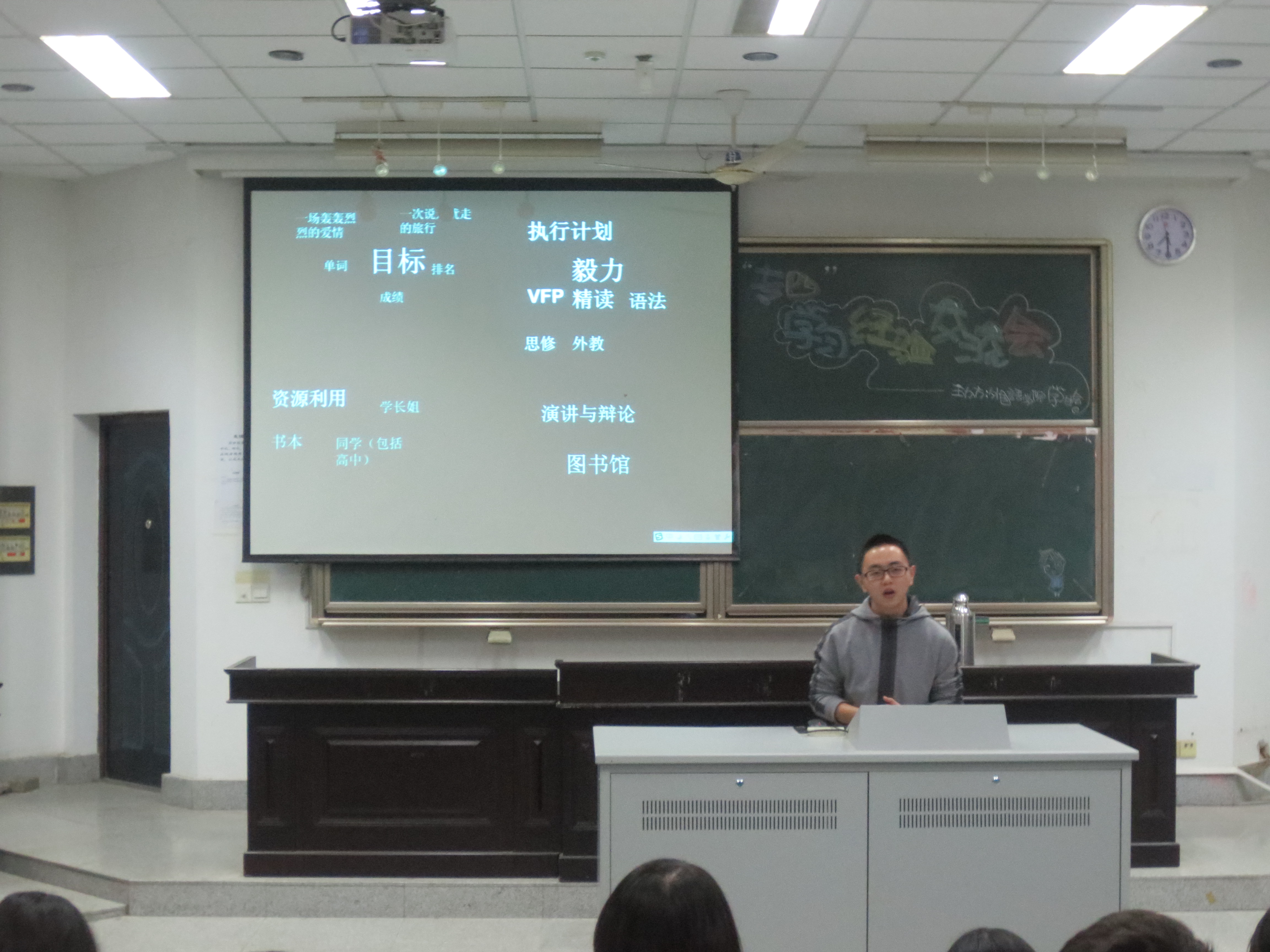 本次经验交流会由学生会学习部部长刘圆同学主持。在简要的开场介绍后, 11级优秀学生代表安桉、史丽君、钱文烨同学为即将面临专四考试的12级学生传授了备考经验,为初涉大学学习的13级新生们分享了英语的学习方法。随后,12级优秀学生代表蓝博同学用生动幽默的辞藻与13级新生们分享了他的学习历程,提醒新生合理利用大学丰富的学习资源,重视课堂学习,提高个人素养。通过优秀学长学姐们的介绍,12级同学对专四有了更深的了解,而13级新生们也从中了解了大学四年的学习目标,在学习中,深知要以目标为引导,以不懈的毅力与合理的方法护航,才能置身学海而有所求获。