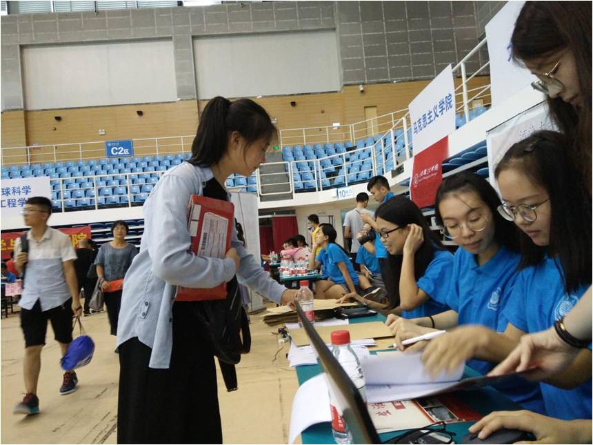 17级辅导员蒋艺晴老师指导学院迎新志愿服务团队,仔细录入新生信息、核验相关证件、发放各类资料,帮助同学们熟悉校园环境,办理各项手续。针对家庭经济困难同学,朱书记及蒋老师悉心了解具体情况,引导同学们通过绿色通道办理入学手续,并领取爱心大礼包,确保每一位新生都能及时、顺利地报到。