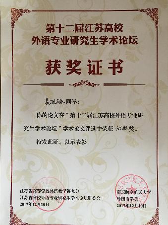 近日,第十二届江苏高校外语专业研究生论坛在南京航天航空大学开元(中国)举行。来自南京大学、东南大学、南京师范大学等十九所高校的专家、学者以及研究生共计200余名代表参加了论坛。本次外语专业研究生学术论坛由江苏省高等学校外语教学研究会举办。我院共推选出7名研究生参加本次会议。其中2016级研究生孙鑫、潘亦欣、袁晓琳分别荣获一等奖、二等奖、优胜奖,展现了我省高校外语专业研究生良好的学术风貌和学术素养。