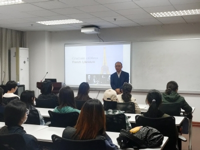 4月10日晚7点,我院在行政楼602举办了教学基层组织活动之教师发展,河海大学兼职教授、原参考消息报社社长、党委书记王朝文教授来我院进行主题为Citations célèbres d’écrivains et leurs plus belles pensées的讲座。学院领导和部分教师参加了讲座,讲座由张海榕院长主持。