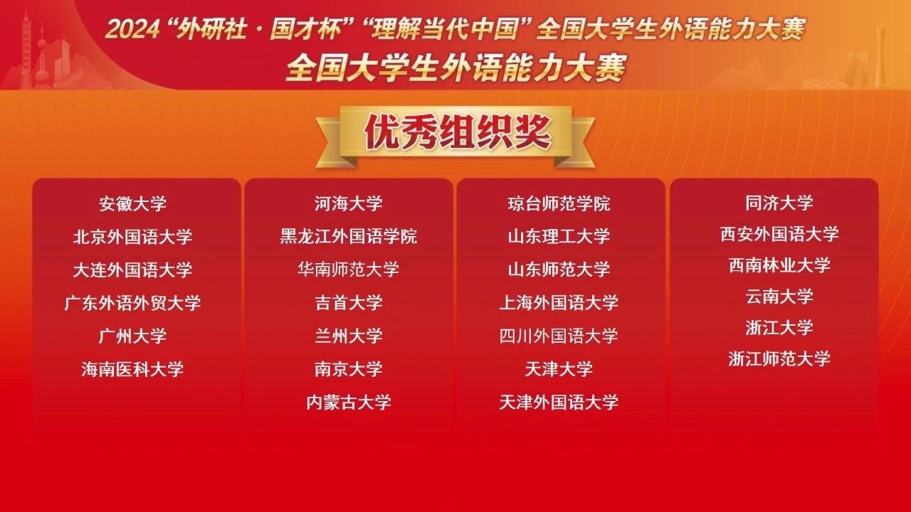 12月9日,2024“外研社·国才杯”“理解当代中国”全国大学生外语能力大赛在北京圆满落幕,我校学子在国际传播综合能力赛项、笔译赛项、短视频赛项中共获得银奖3项、铜奖3项,学校被授予优秀组织奖。