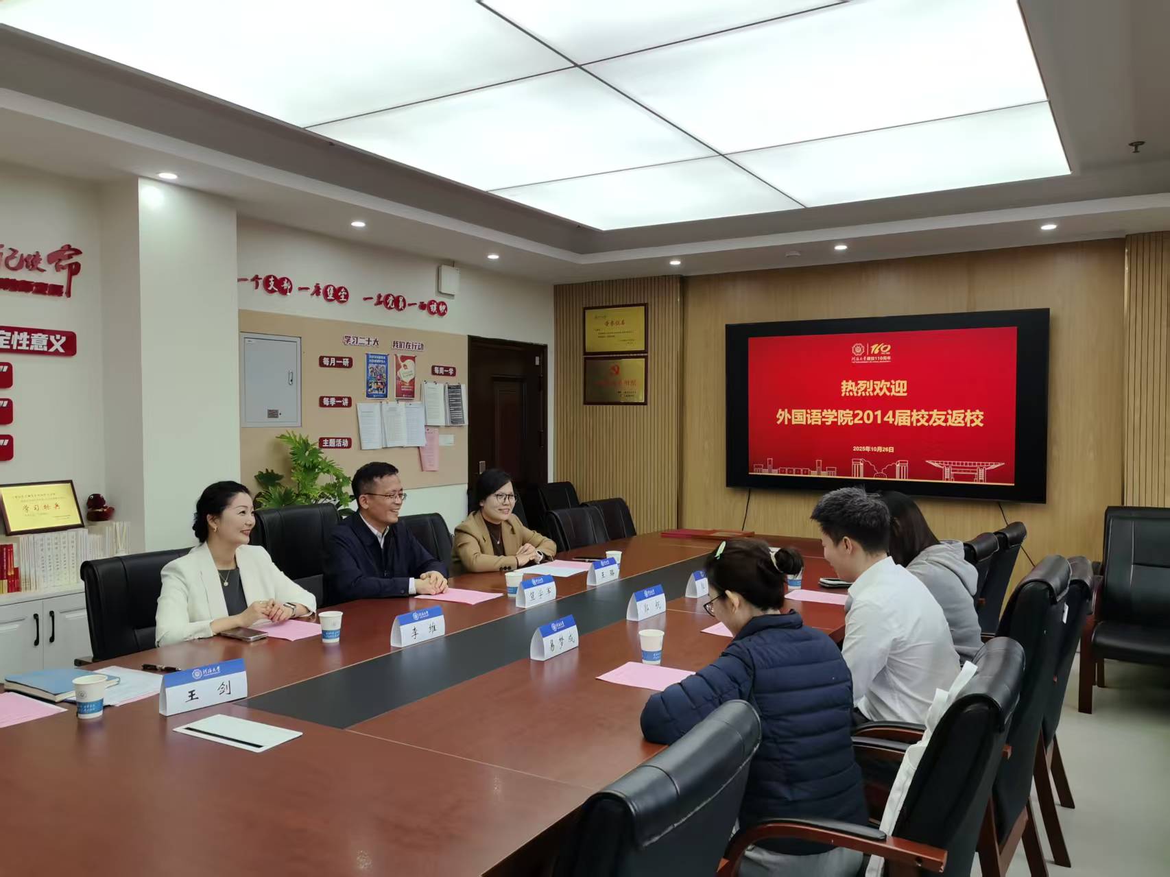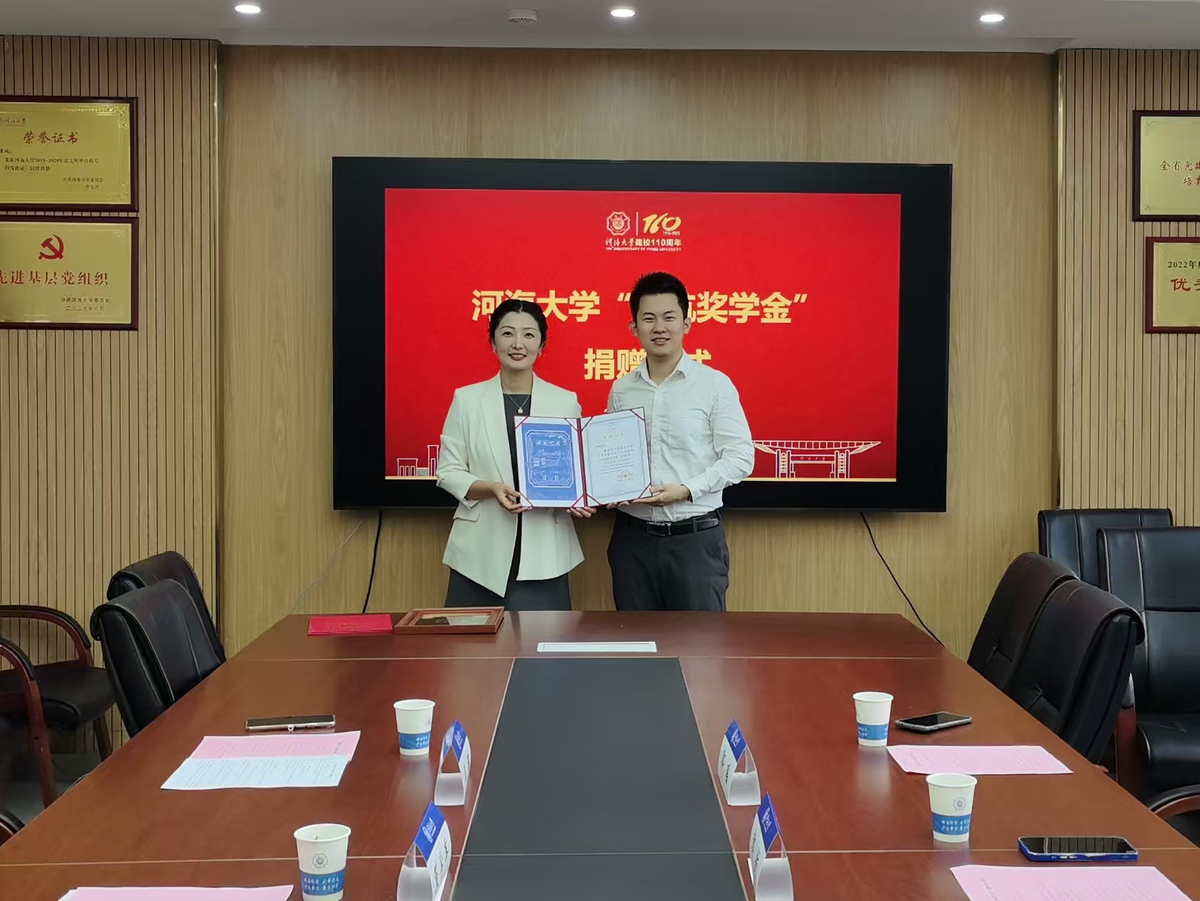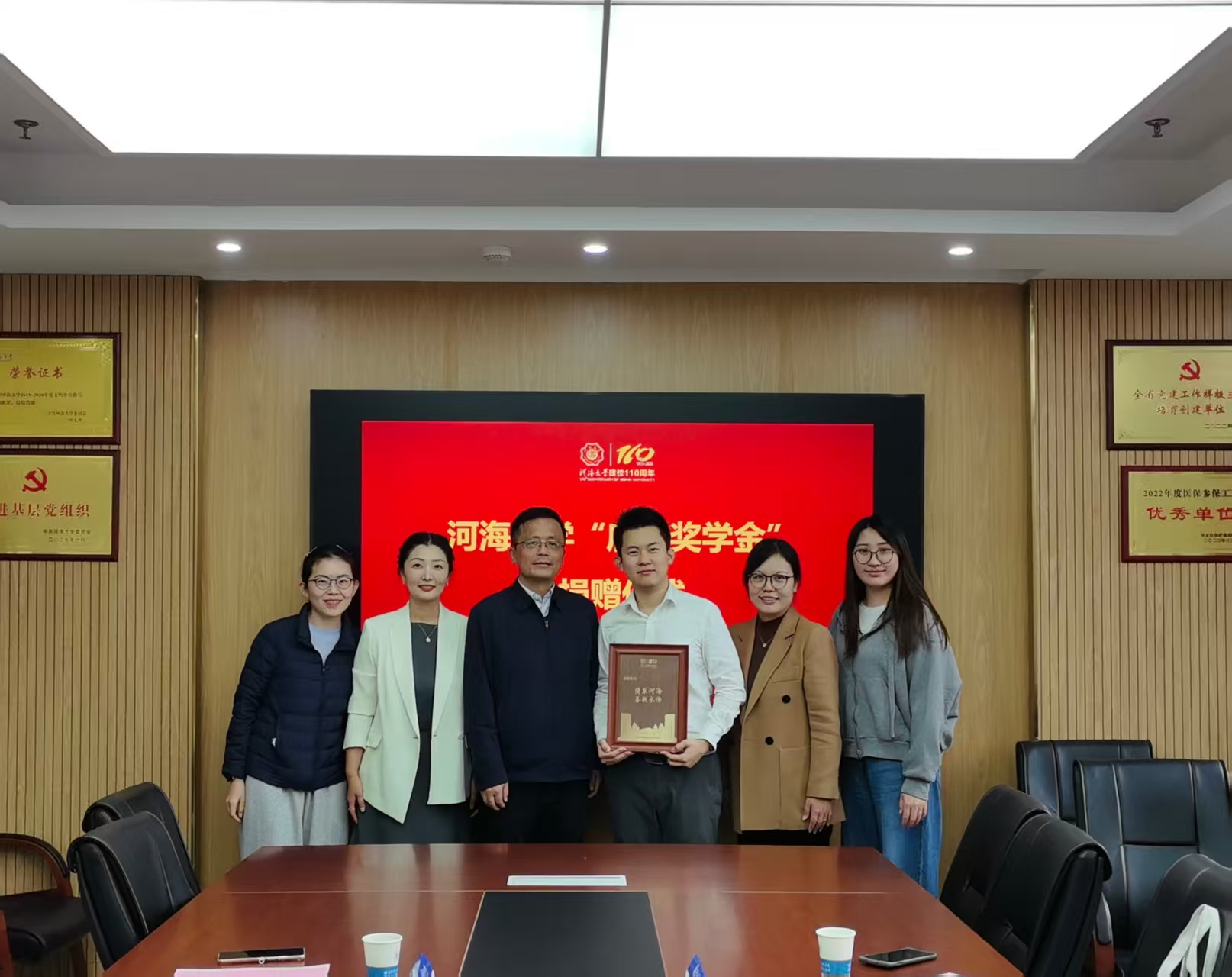 李维副处长为郭航校友颁发捐赠证书和纪念铭牌,与会人员深入交流并合影留念。